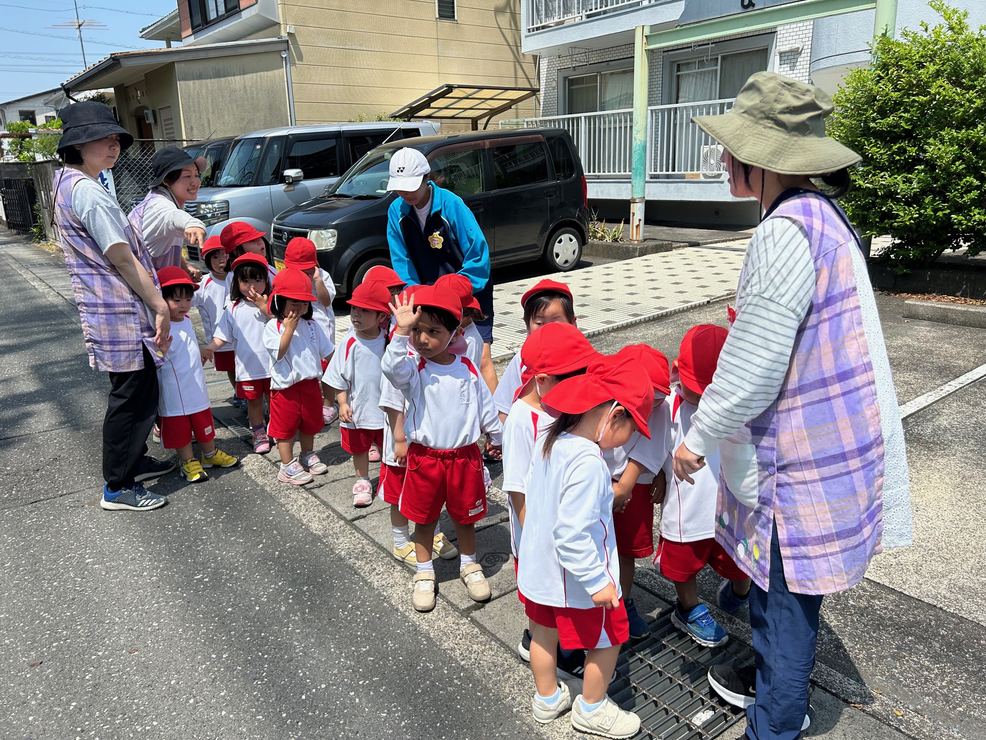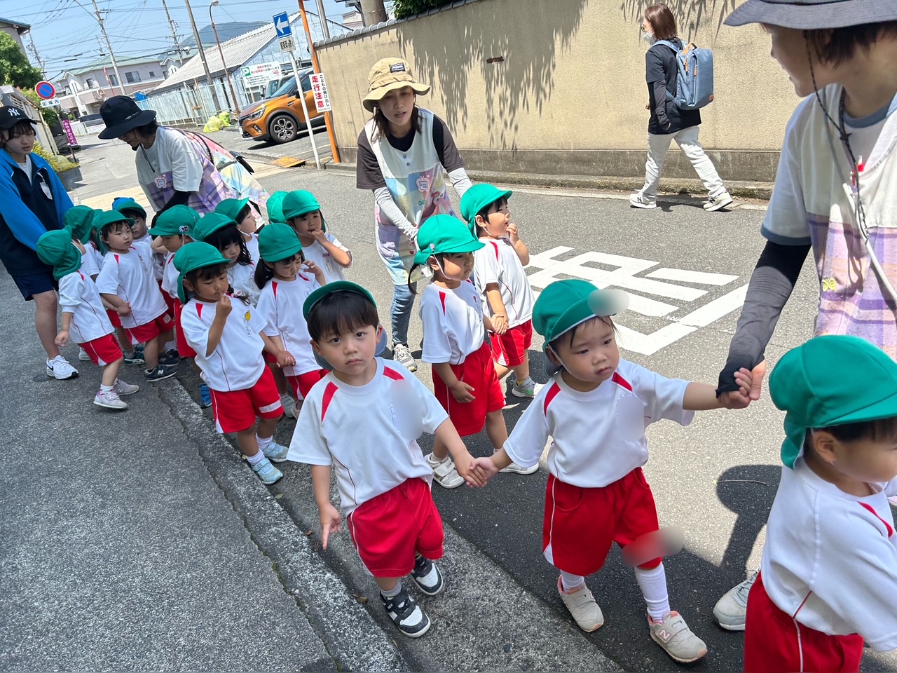 「お友達としっかり手をつないでね!」「車が来たら壁ぺったんこだよ!」と約束を確認して、出発☆